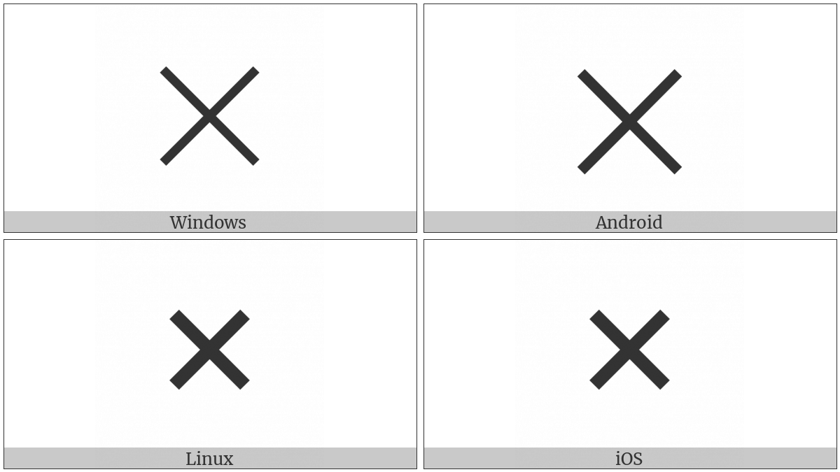 The image below shows how the “Multiplication X” symbol might look like on different operating systems. If the font in which this web site is displayed does not contain the symbol and there is no fallback font able to render it, you can use the image below to get an idea of what it should look like.