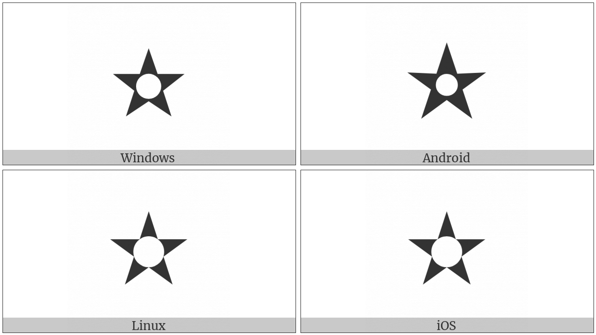 The image below shows how the “Open Centre Black Star” symbol might look like on different operating systems. If the font in which this web site is displayed does not contain the symbol and there is no fallback font able to render it, you can use the image below to get an idea of what it should look like.