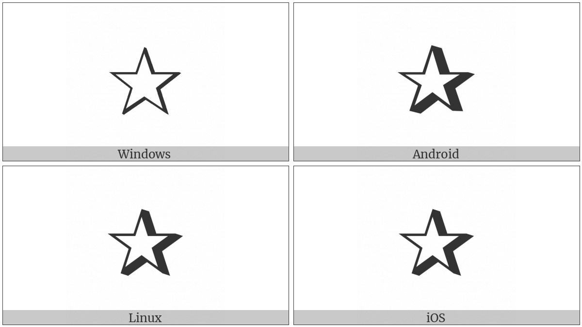 The image below shows how the “Shadowed White Star” symbol might look like on different operating systems. If the font in which this web site is displayed does not contain the symbol and there is no fallback font able to render it, you can use the image below to get an idea of what it should look like.