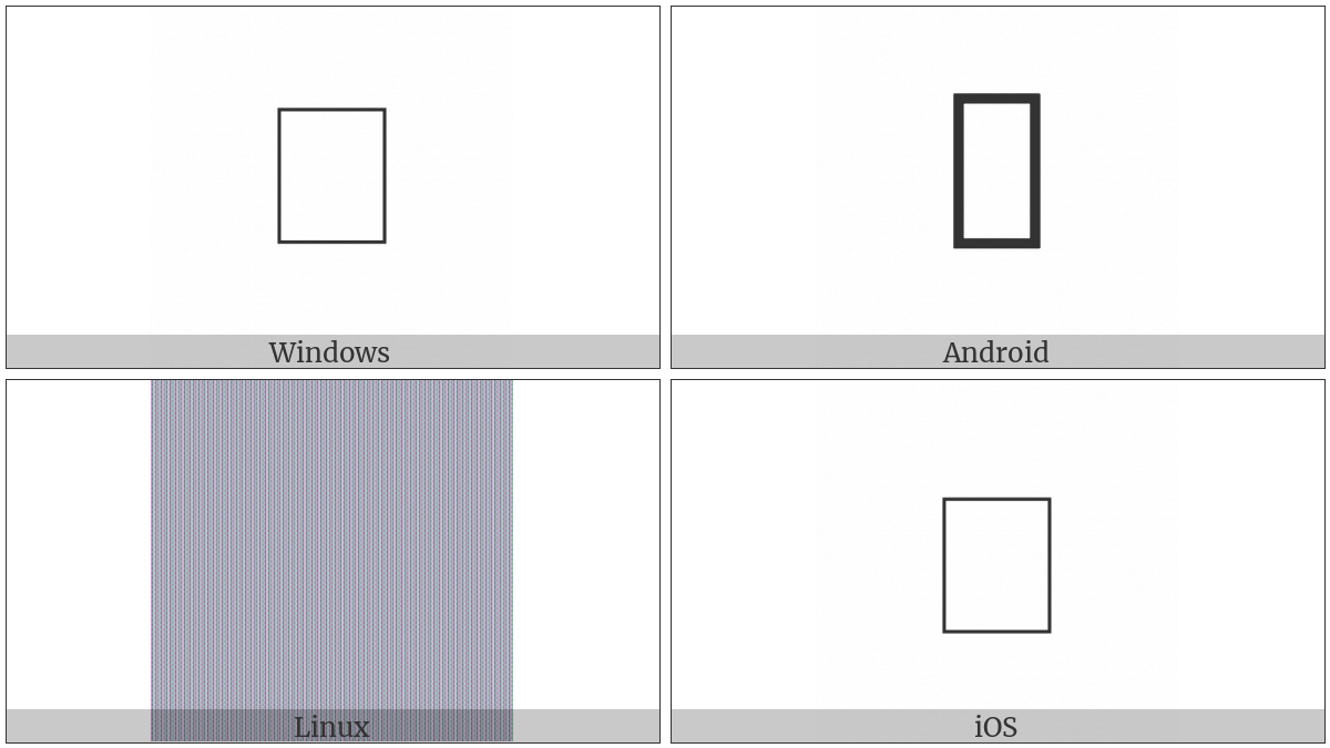 The image below shows how the “Tangut Component-001” symbol might look like on different operating systems. If the font in which this web site is displayed does not contain the symbol and there is no fallback font able to render it, you can use the image below to get an idea of what it should look like.