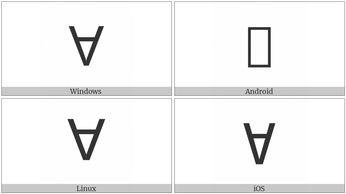 The image below shows how the “Latin Capital Letter Turned A” symbol might look like on different operating systems. If the font in which this web site is displayed does not contain the symbol and there is no fallback font able to render it, you can use the image below to get an idea of what it should look like.