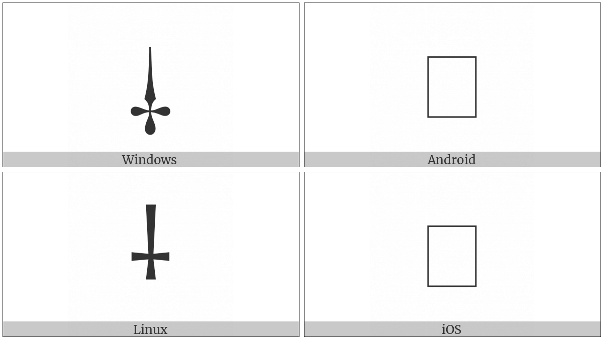 The image below shows how the “Turned Dagger” symbol might look like on different operating systems. If the font in which this web site is displayed does not contain the symbol and there is no fallback font able to render it, you can use the image below to get an idea of what it should look like.