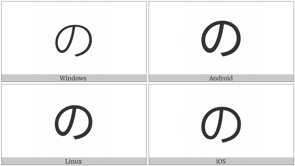 The image below shows how the “Hiragana Letter No” symbol might look like on different operating systems. If the font in which this web site is displayed does not contain the symbol and there is no fallback font able to render it, you can use the image below to get an idea of what it should look like.
