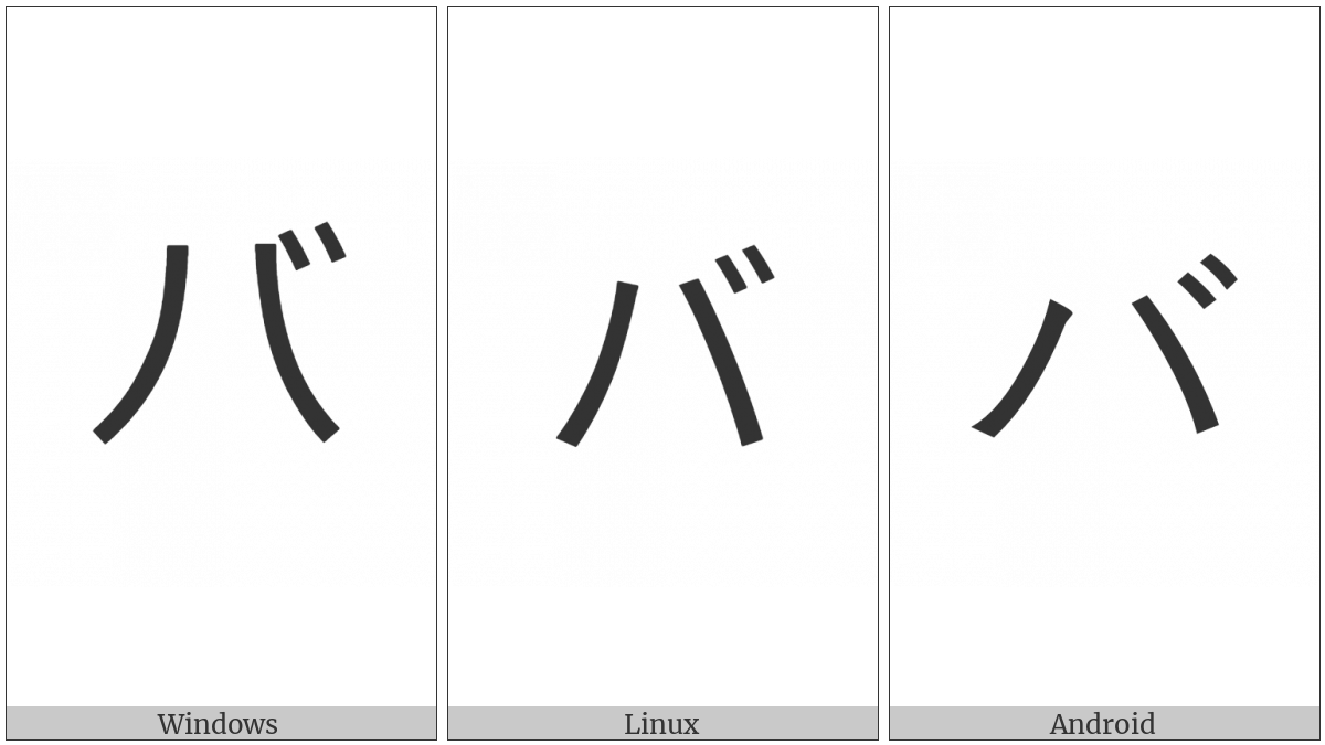 The image below shows how the “Katakana Letter Ba” symbol might look like on different operating systems. If the font in which this web site is displayed does not contain the symbol and there is no fallback font able to render it, you can use the image below to get an idea of what it should look like.