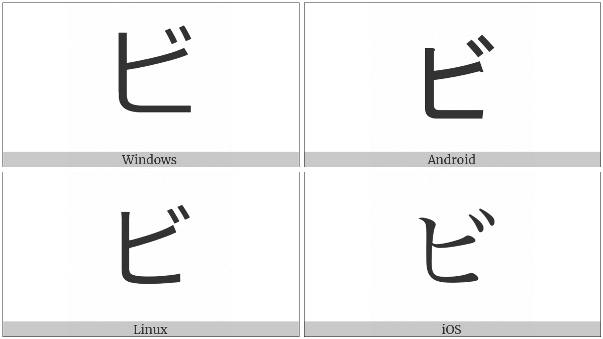 The image below shows how the “Katakana Letter Bi” symbol might look like on different operating systems. If the font in which this web site is displayed does not contain the symbol and there is no fallback font able to render it, you can use the image below to get an idea of what it should look like.