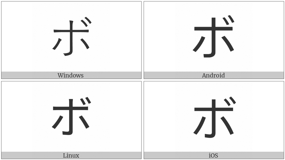 The image below shows how the “Katakana Letter Bo” symbol might look like on different operating systems. If the font in which this web site is displayed does not contain the symbol and there is no fallback font able to render it, you can use the image below to get an idea of what it should look like.