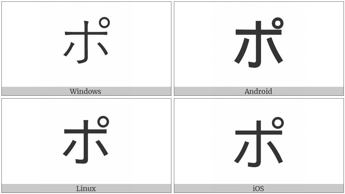 The image below shows how the “Katakana Letter Po” symbol might look like on different operating systems. If the font in which this web site is displayed does not contain the symbol and there is no fallback font able to render it, you can use the image below to get an idea of what it should look like.
