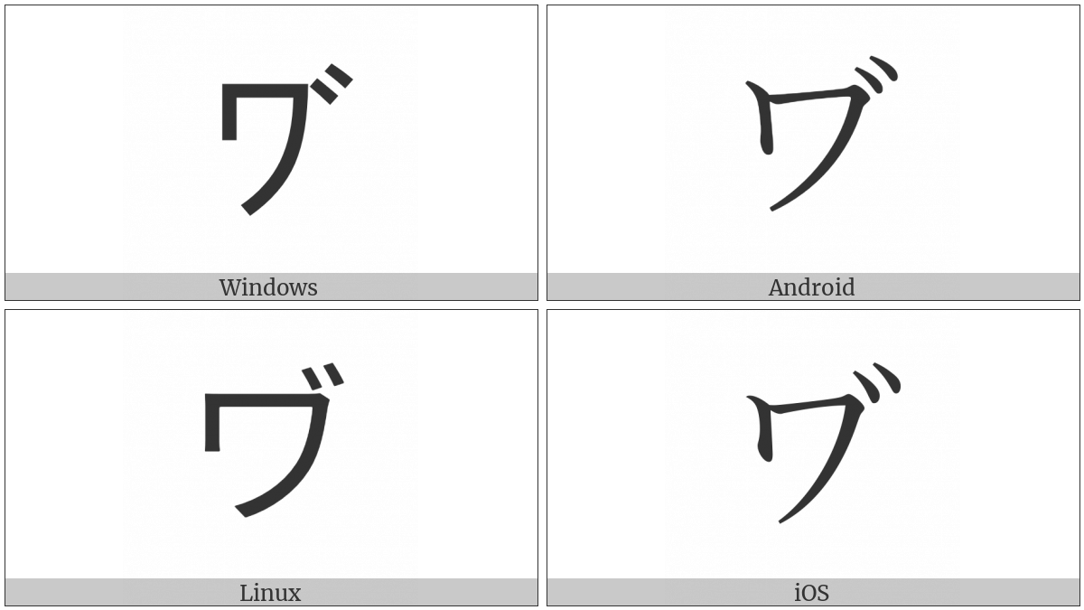The image below shows how the “Katakana Letter Va” symbol might look like on different operating systems. If the font in which this web site is displayed does not contain the symbol and there is no fallback font able to render it, you can use the image below to get an idea of what it should look like.