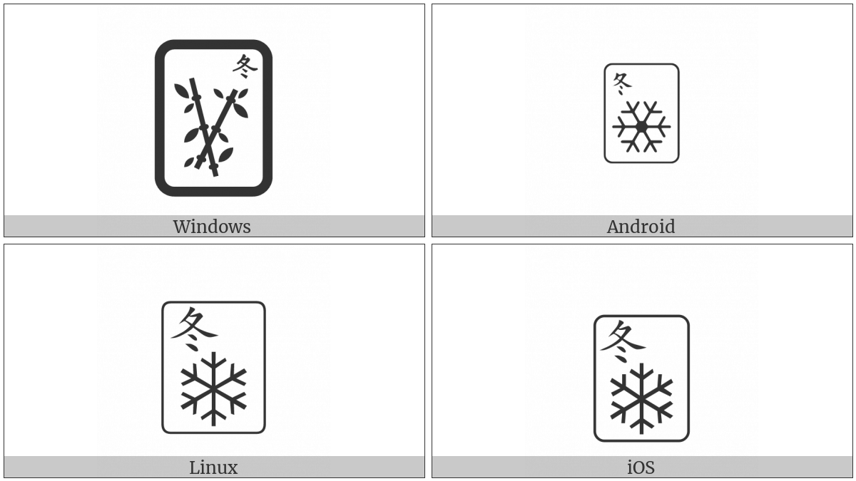 The image below shows how the “Mahjong Tile Winter” symbol might look like on different operating systems. If the font in which this web site is displayed does not contain the symbol and there is no fallback font able to render it, you can use the image below to get an idea of what it should look like.