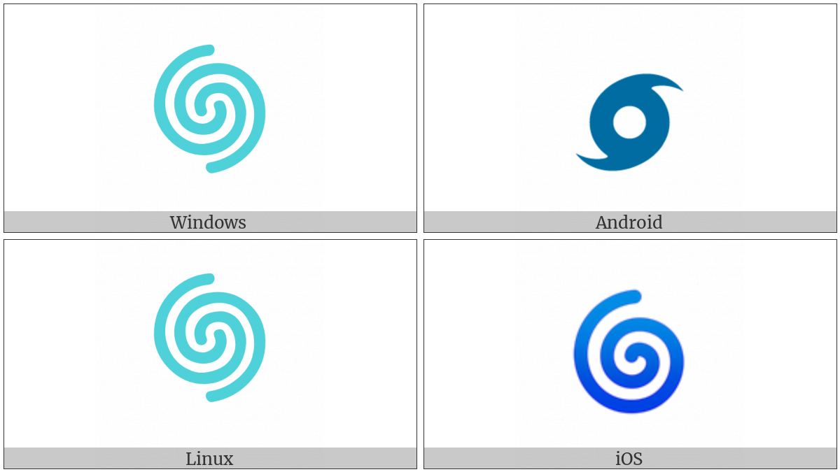 The image below shows how the “Cyclone” symbol might look like on different operating systems. If the font in which this web site is displayed does not contain the symbol and there is no fallback font able to render it, you can use the image below to get an idea of what it should look like.