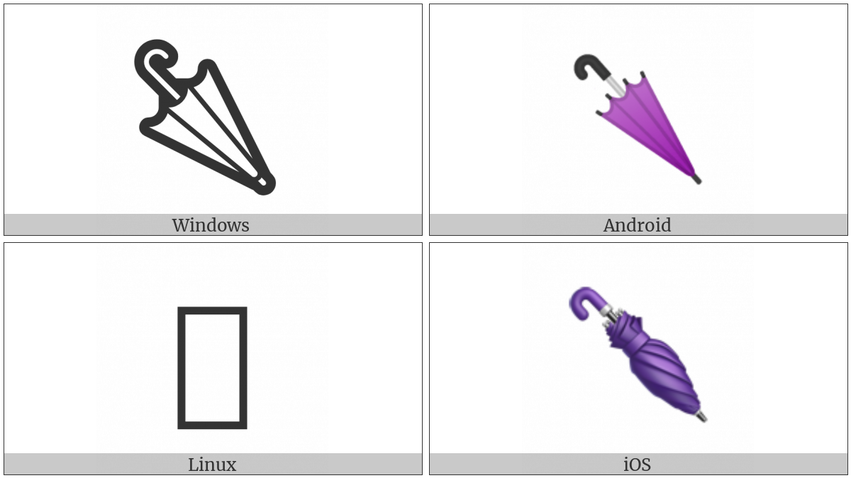 The image below shows how the “Closed Umbrella” symbol might look like on different operating systems. If the font in which this web site is displayed does not contain the symbol and there is no fallback font able to render it, you can use the image below to get an idea of what it should look like.