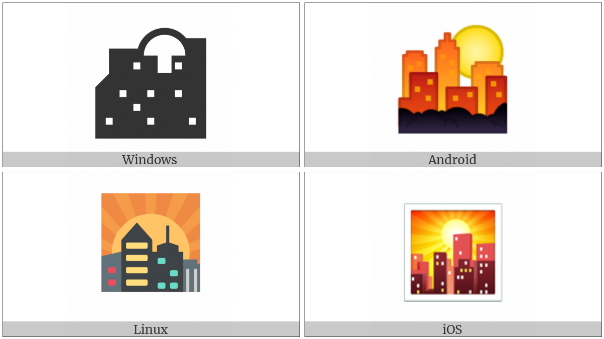The image below shows how the “Sunset Over Buildings” symbol might look like on different operating systems. If the font in which this web site is displayed does not contain the symbol and there is no fallback font able to render it, you can use the image below to get an idea of what it should look like.