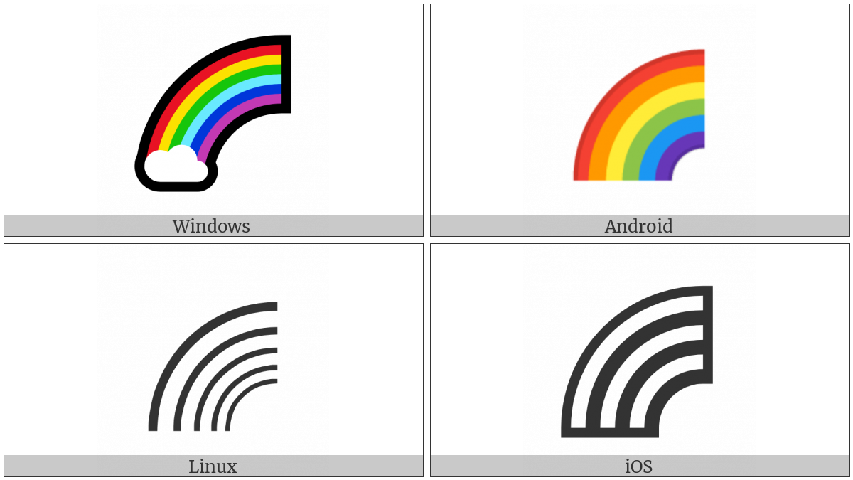 The image below shows how the “Rainbow” symbol might look like on different operating systems. If the font in which this web site is displayed does not contain the symbol and there is no fallback font able to render it, you can use the image below to get an idea of what it should look like.