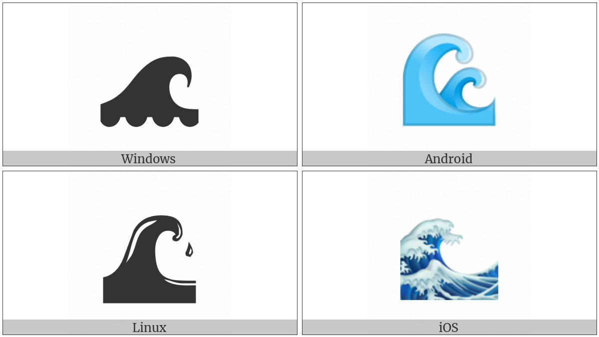 The image below shows how the “Water Wave” symbol might look like on different operating systems. If the font in which this web site is displayed does not contain the symbol and there is no fallback font able to render it, you can use the image below to get an idea of what it should look like.