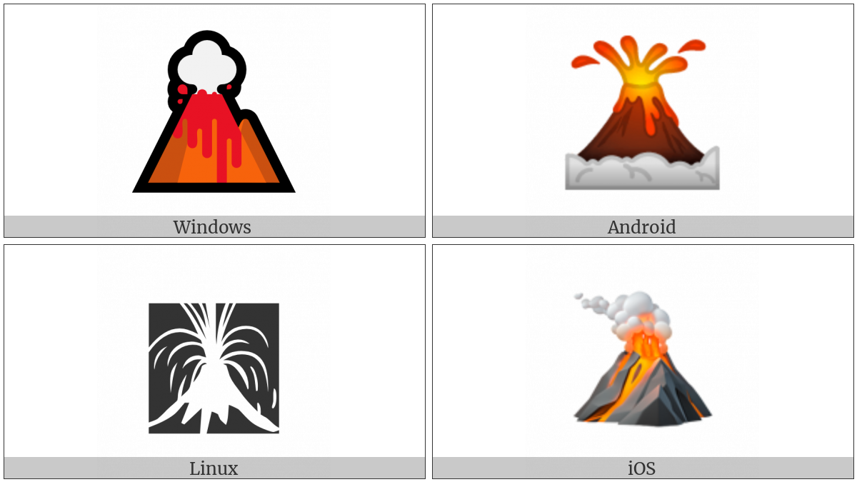 The image below shows how the “Volcano” symbol might look like on different operating systems. If the font in which this web site is displayed does not contain the symbol and there is no fallback font able to render it, you can use the image below to get an idea of what it should look like.