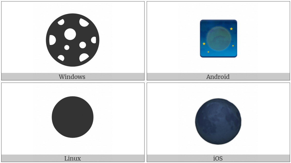The image below shows how the “New Moon Symbol” symbol might look like on different operating systems. If the font in which this web site is displayed does not contain the symbol and there is no fallback font able to render it, you can use the image below to get an idea of what it should look like.