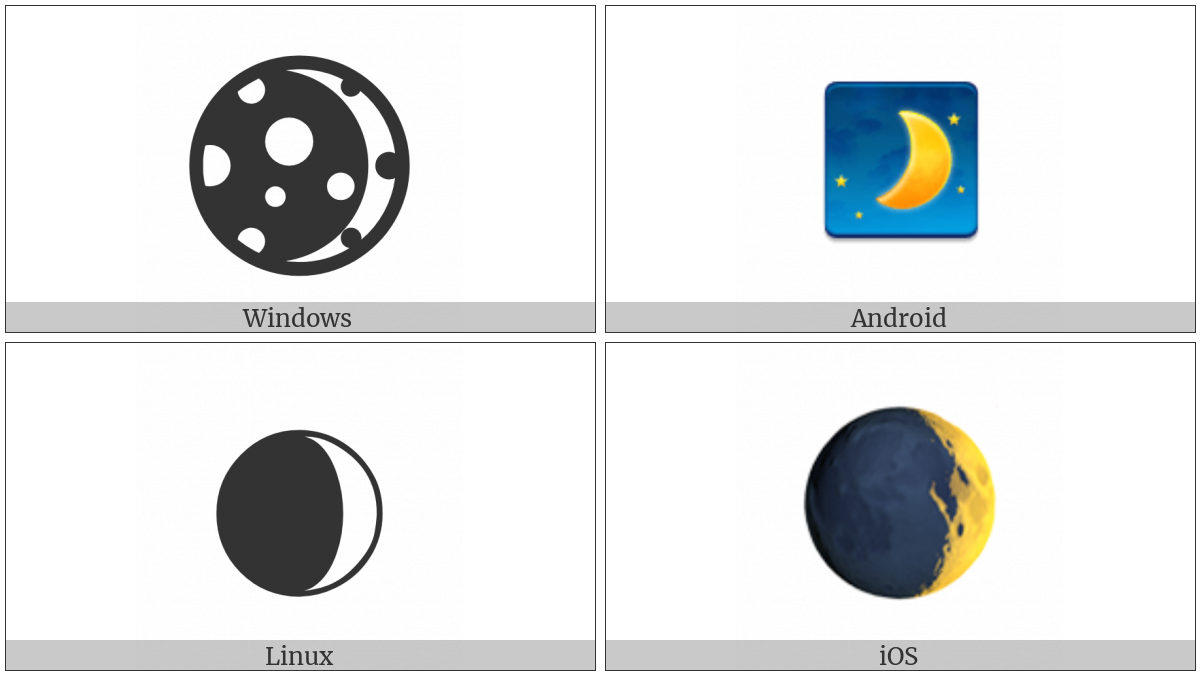The image below shows how the “Waxing Crescent Moon Symbol” symbol might look like on different operating systems. If the font in which this web site is displayed does not contain the symbol and there is no fallback font able to render it, you can use the image below to get an idea of what it should look like.