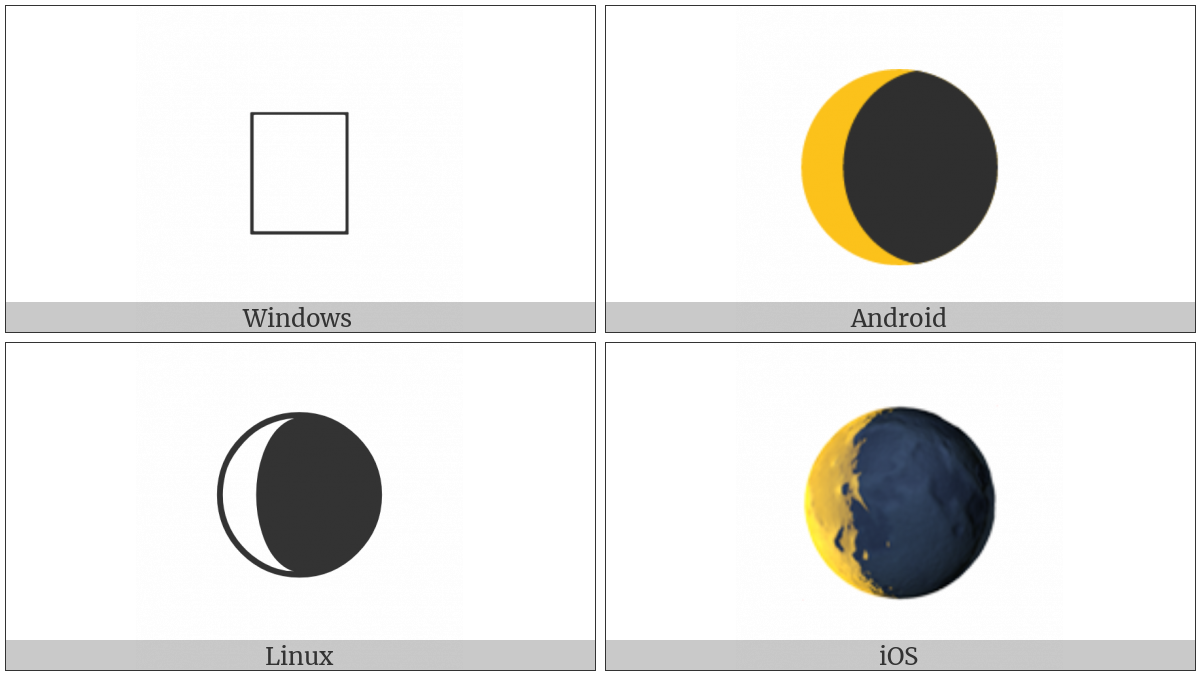 The image below shows how the “Waning Crescent Moon Symbol” symbol might look like on different operating systems. If the font in which this web site is displayed does not contain the symbol and there is no fallback font able to render it, you can use the image below to get an idea of what it should look like.
