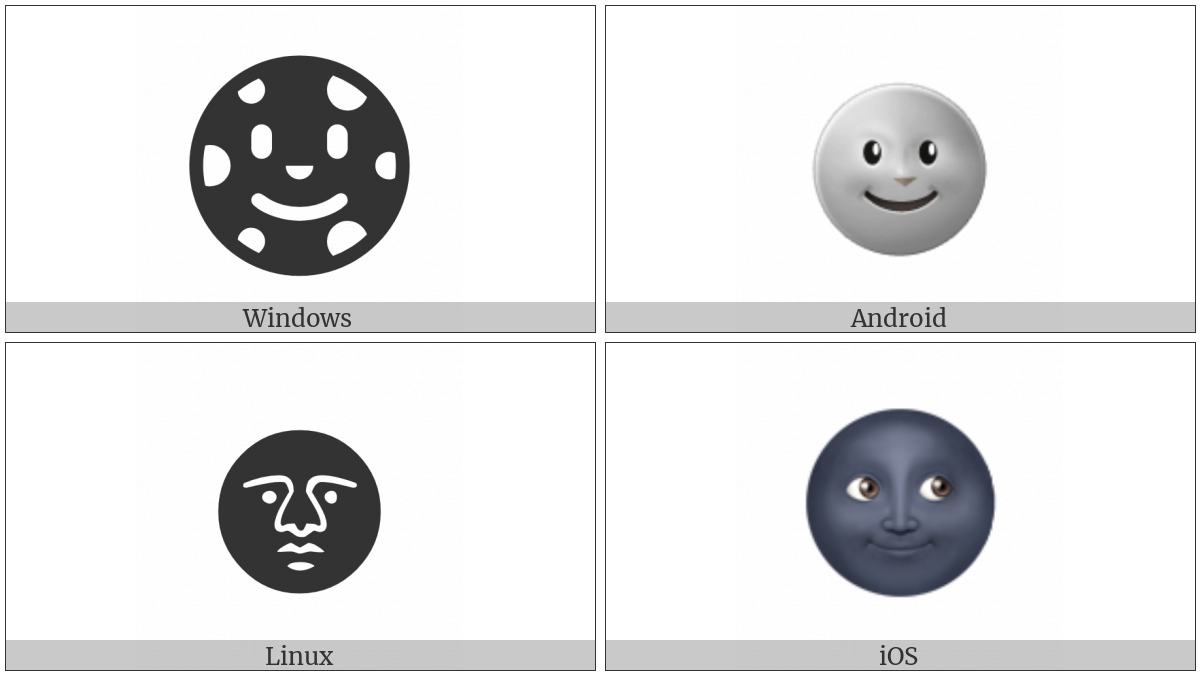The image below shows how the “New Moon With Face” symbol might look like on different operating systems. If the font in which this web site is displayed does not contain the symbol and there is no fallback font able to render it, you can use the image below to get an idea of what it should look like.