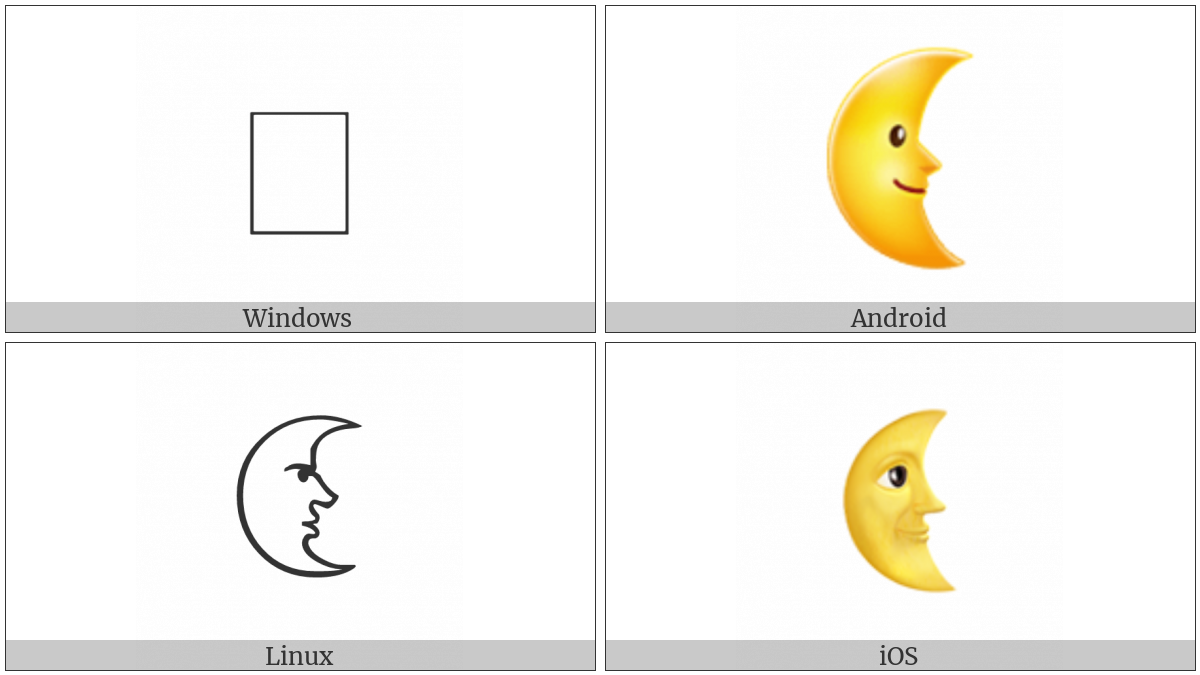 The image below shows how the “Last Quarter Moon With Face” symbol might look like on different operating systems. If the font in which this web site is displayed does not contain the symbol and there is no fallback font able to render it, you can use the image below to get an idea of what it should look like.