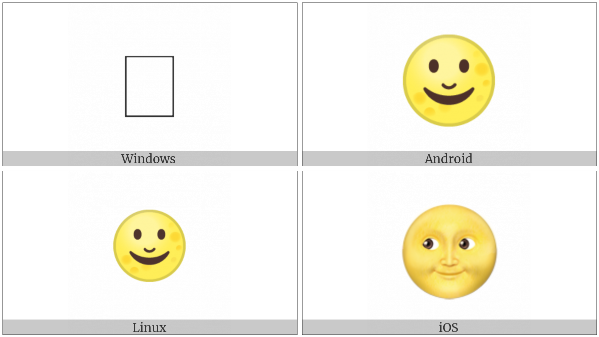 The image below shows how the “Full Moon With Face” symbol might look like on different operating systems. If the font in which this web site is displayed does not contain the symbol and there is no fallback font able to render it, you can use the image below to get an idea of what it should look like.