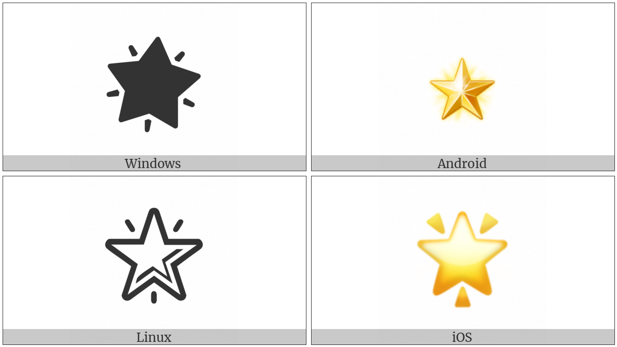 The image below shows how the “Glowing Star” symbol might look like on different operating systems. If the font in which this web site is displayed does not contain the symbol and there is no fallback font able to render it, you can use the image below to get an idea of what it should look like.