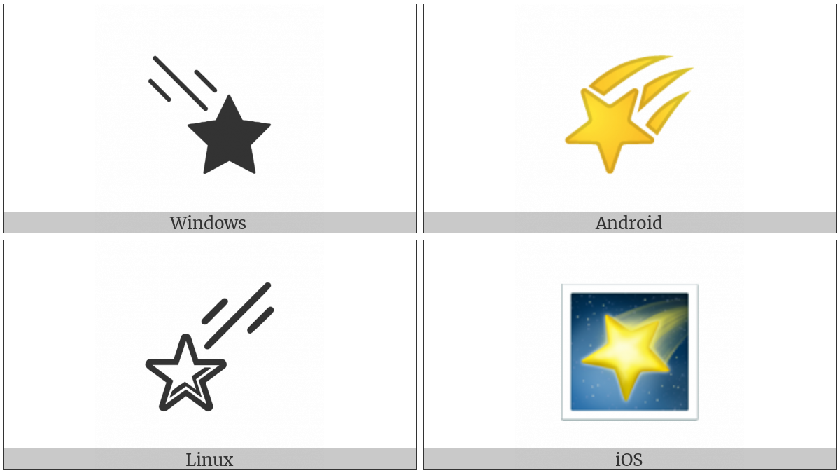 The image below shows how the “Shooting Star” symbol might look like on different operating systems. If the font in which this web site is displayed does not contain the symbol and there is no fallback font able to render it, you can use the image below to get an idea of what it should look like.