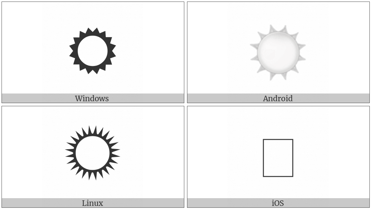 The image below shows how the “White Sun” symbol might look like on different operating systems. If the font in which this web site is displayed does not contain the symbol and there is no fallback font able to render it, you can use the image below to get an idea of what it should look like.