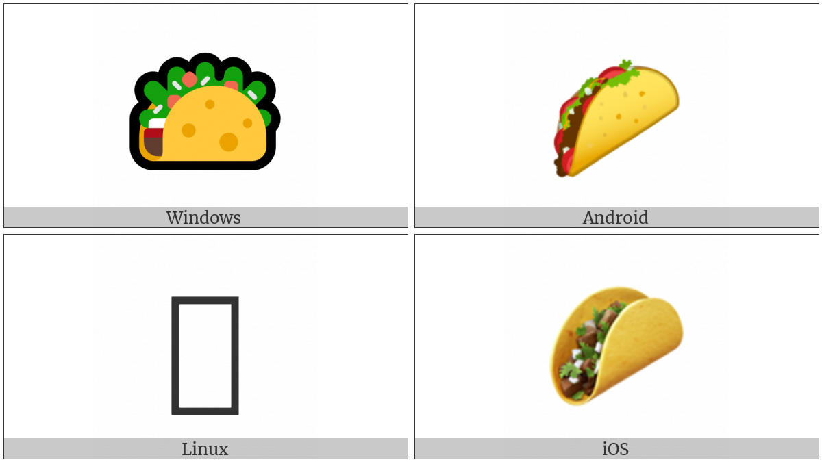 The image below shows how the “Taco” symbol might look like on different operating systems. If the font in which this web site is displayed does not contain the symbol and there is no fallback font able to render it, you can use the image below to get an idea of what it should look like.