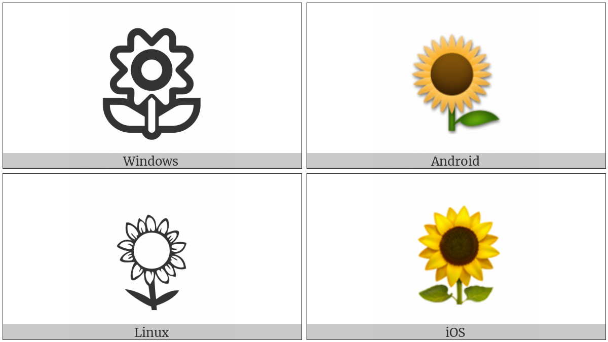 The image below shows how the “Sunflower” symbol might look like on different operating systems. If the font in which this web site is displayed does not contain the symbol and there is no fallback font able to render it, you can use the image below to get an idea of what it should look like.