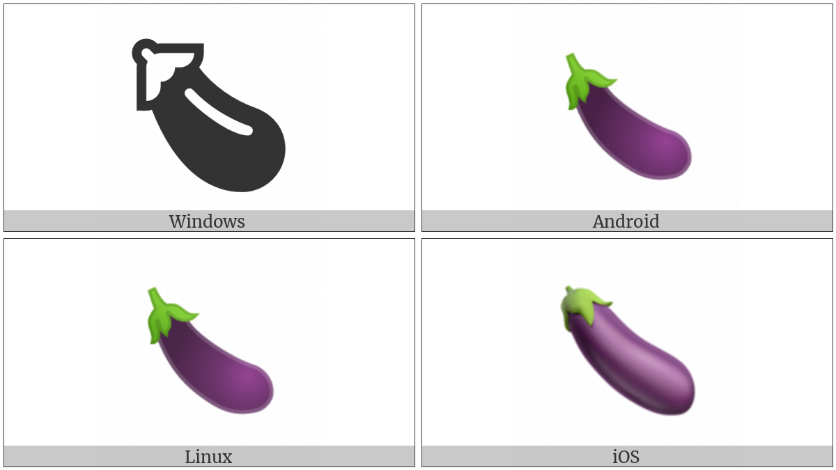 The image below shows how the “Aubergine” symbol might look like on different operating systems. If the font in which this web site is displayed does not contain the symbol and there is no fallback font able to render it, you can use the image below to get an idea of what it should look like.