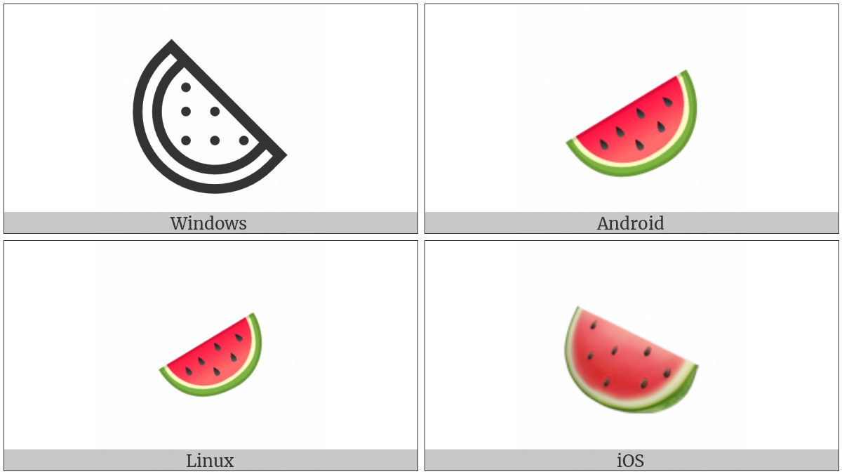The image below shows how the “Watermelon” symbol might look like on different operating systems. If the font in which this web site is displayed does not contain the symbol and there is no fallback font able to render it, you can use the image below to get an idea of what it should look like.
