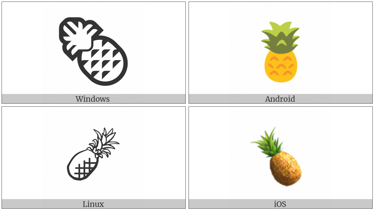 The image below shows how the “Pineapple” symbol might look like on different operating systems. If the font in which this web site is displayed does not contain the symbol and there is no fallback font able to render it, you can use the image below to get an idea of what it should look like.
