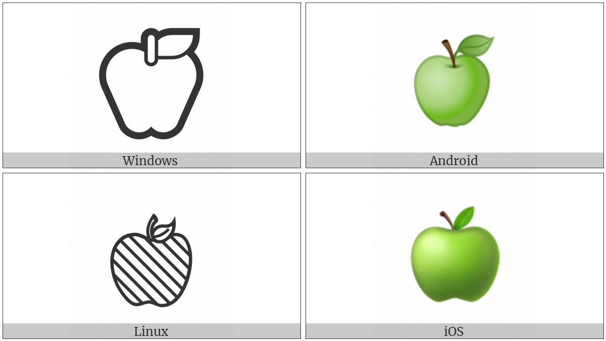 The image below shows how the “Green Apple” symbol might look like on different operating systems. If the font in which this web site is displayed does not contain the symbol and there is no fallback font able to render it, you can use the image below to get an idea of what it should look like.