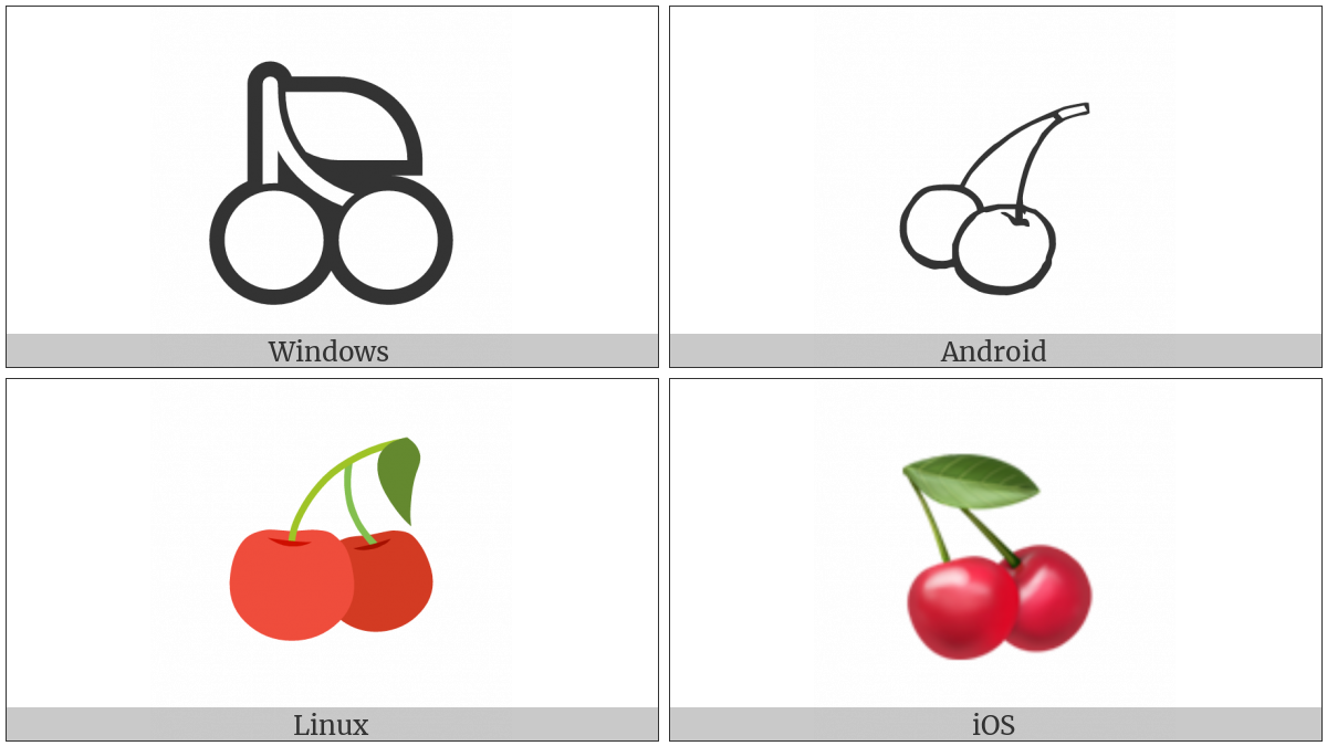 The image below shows how the “Cherries” symbol might look like on different operating systems. If the font in which this web site is displayed does not contain the symbol and there is no fallback font able to render it, you can use the image below to get an idea of what it should look like.