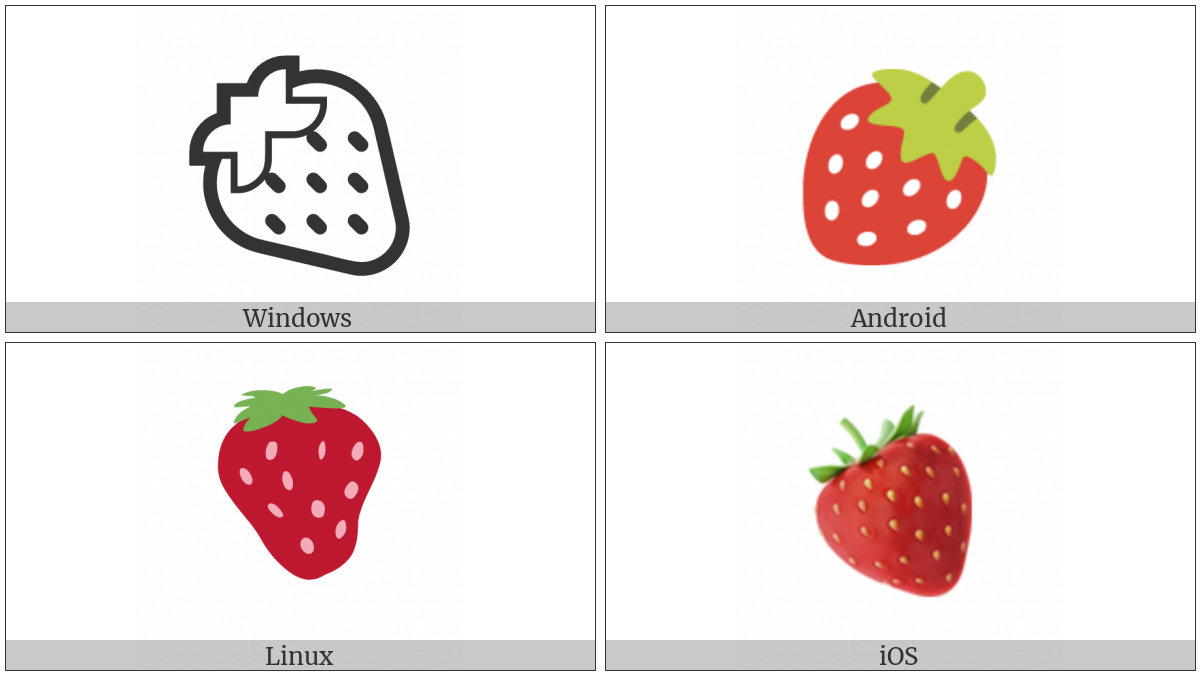 The image below shows how the “Strawberry” symbol might look like on different operating systems. If the font in which this web site is displayed does not contain the symbol and there is no fallback font able to render it, you can use the image below to get an idea of what it should look like.