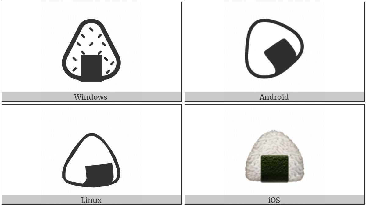 The image below shows how the “Rice Ball” symbol might look like on different operating systems. If the font in which this web site is displayed does not contain the symbol and there is no fallback font able to render it, you can use the image below to get an idea of what it should look like.