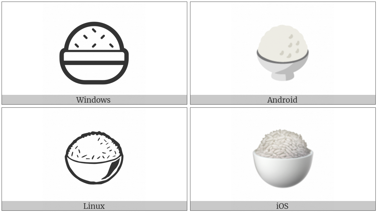 The image below shows how the “Cooked Rice” symbol might look like on different operating systems. If the font in which this web site is displayed does not contain the symbol and there is no fallback font able to render it, you can use the image below to get an idea of what it should look like.