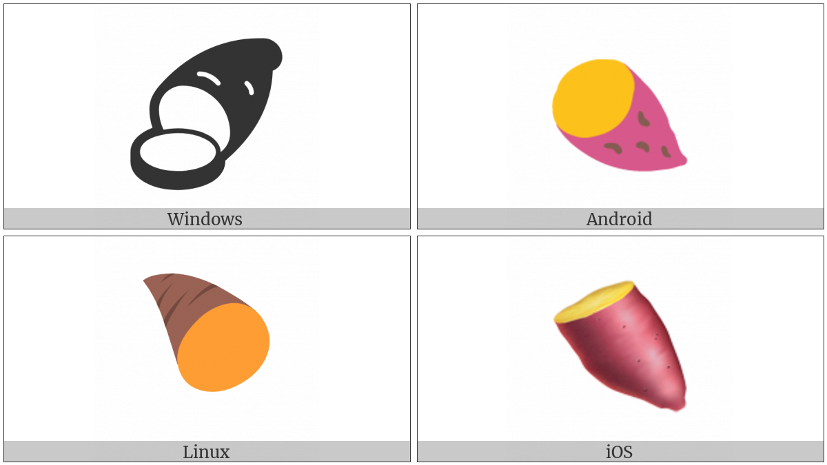 The image below shows how the “Roasted Sweet Potato” symbol might look like on different operating systems. If the font in which this web site is displayed does not contain the symbol and there is no fallback font able to render it, you can use the image below to get an idea of what it should look like.