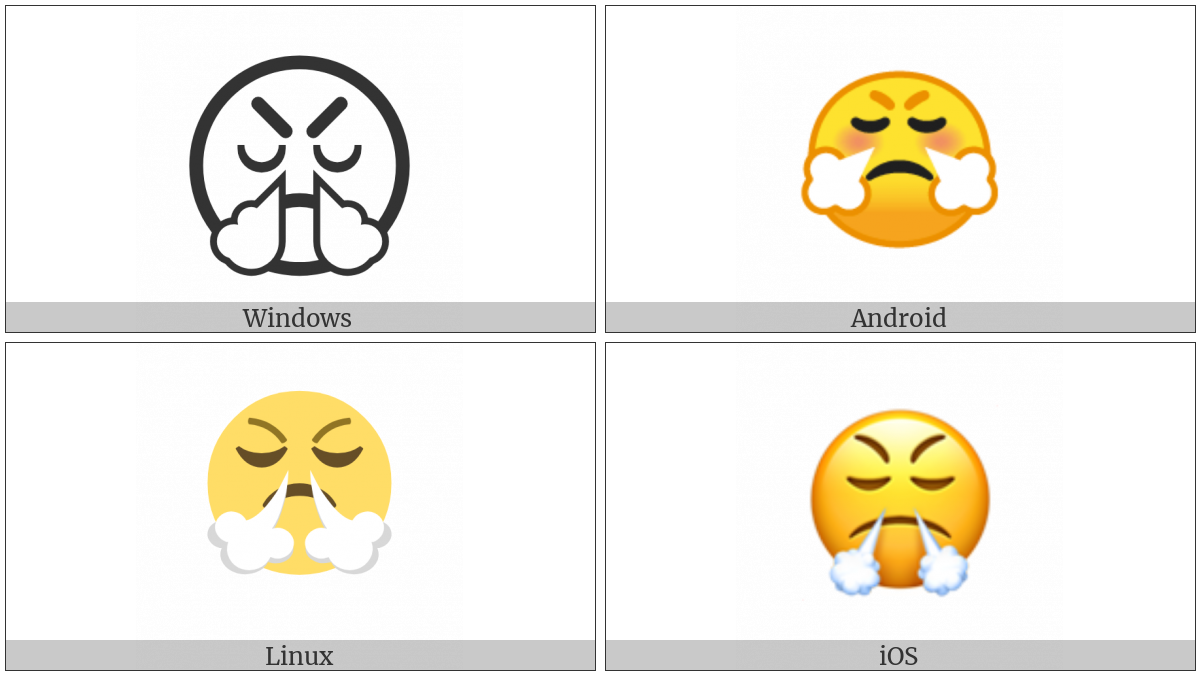 The image below shows how the “Face With Look Of Triumph” symbol might look like on different operating systems. If the font in which this web site is displayed does not contain the symbol and there is no fallback font able to render it, you can use the image below to get an idea of what it should look like.