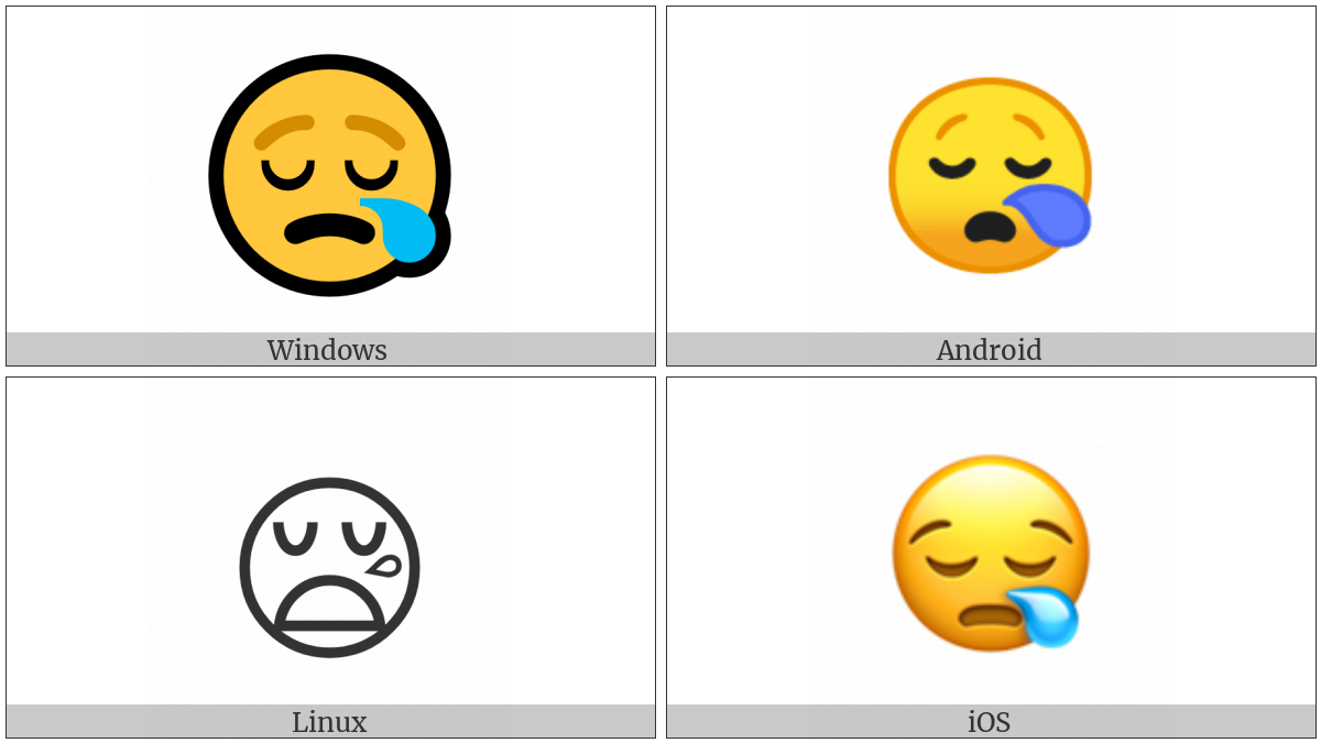 The image below shows how the “Sleepy Face” symbol might look like on different operating systems. If the font in which this web site is displayed does not contain the symbol and there is no fallback font able to render it, you can use the image below to get an idea of what it should look like.