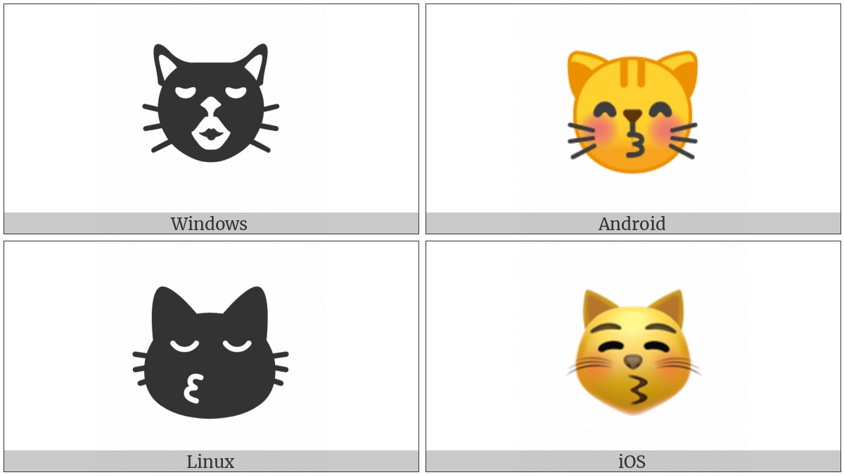 The image below shows how the “Kissing Cat Face With Closed Eyes” symbol might look like on different operating systems. If the font in which this web site is displayed does not contain the symbol and there is no fallback font able to render it, you can use the image below to get an idea of what it should look like.
