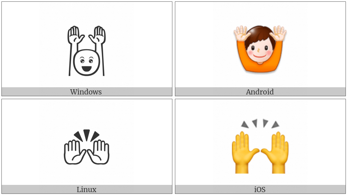 The image below shows how the “Person Raising Both Hands In Celebration” symbol might look like on different operating systems. If the font in which this web site is displayed does not contain the symbol and there is no fallback font able to render it, you can use the image below to get an idea of what it should look like.