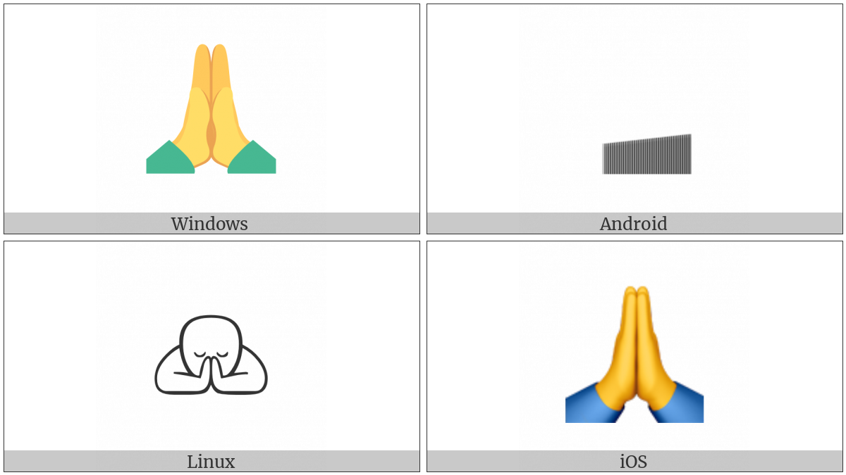 The image below shows how the “Person With Folded Hands” symbol might look like on different operating systems. If the font in which this web site is displayed does not contain the symbol and there is no fallback font able to render it, you can use the image below to get an idea of what it should look like.