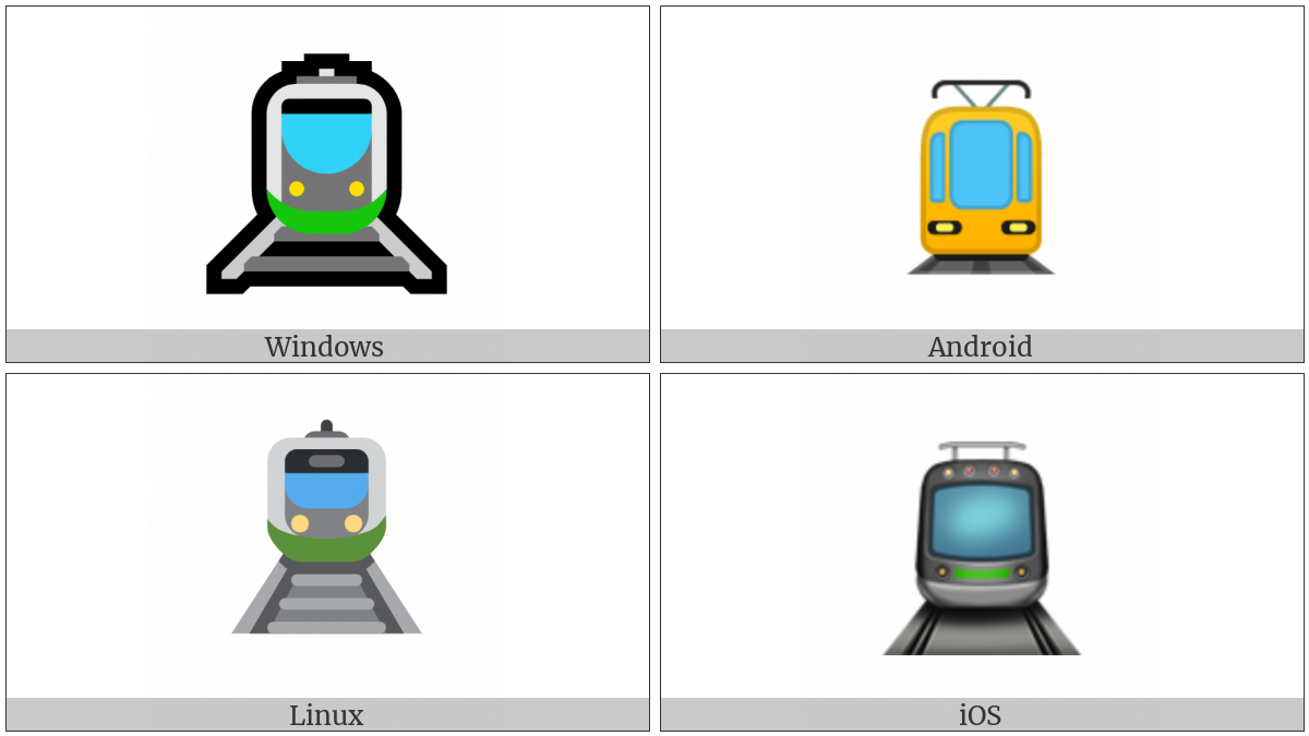The image below shows how the “Tram” symbol might look like on different operating systems. If the font in which this web site is displayed does not contain the symbol and there is no fallback font able to render it, you can use the image below to get an idea of what it should look like.