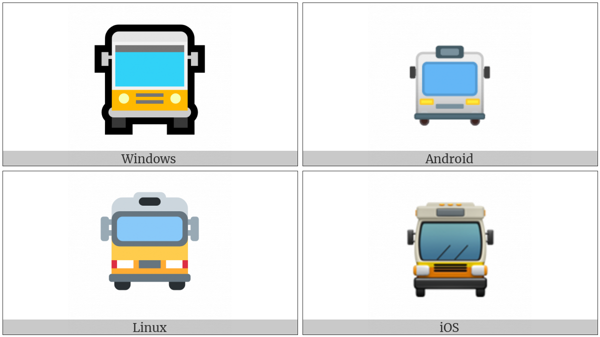 The image below shows how the “Oncoming Bus” symbol might look like on different operating systems. If the font in which this web site is displayed does not contain the symbol and there is no fallback font able to render it, you can use the image below to get an idea of what it should look like.