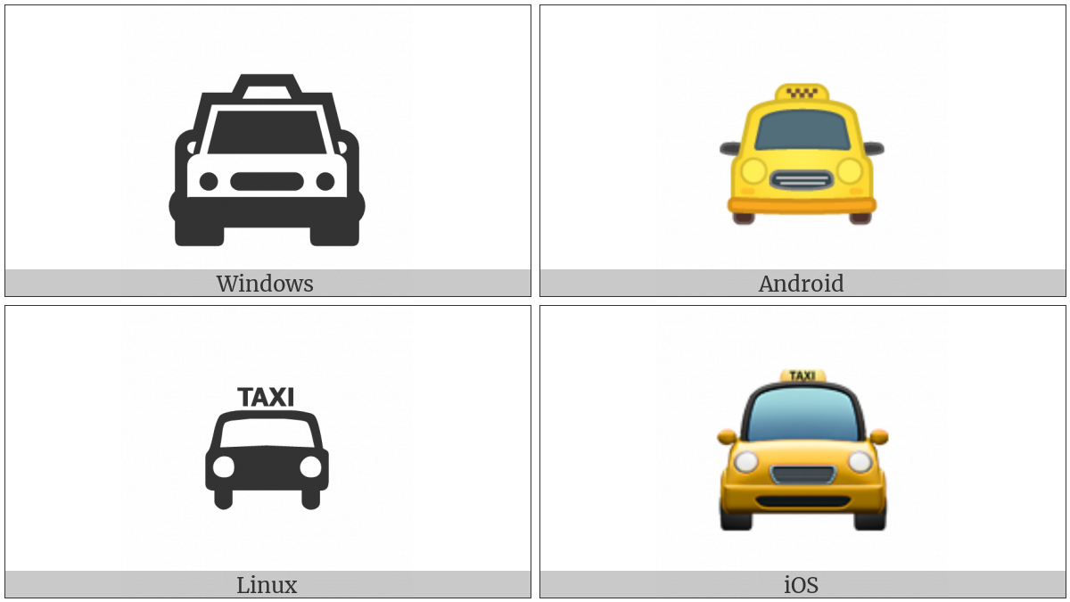 The image below shows how the “Oncoming Taxi” symbol might look like on different operating systems. If the font in which this web site is displayed does not contain the symbol and there is no fallback font able to render it, you can use the image below to get an idea of what it should look like.