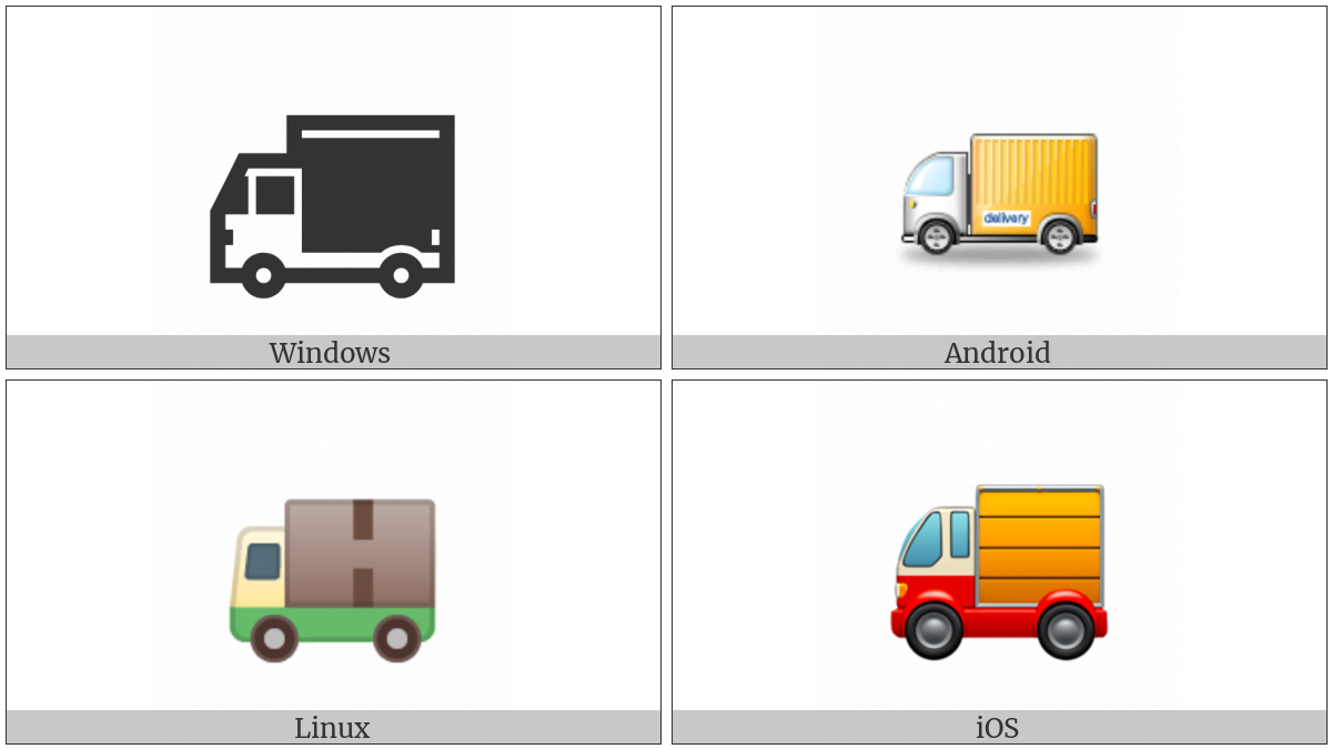 The image below shows how the “Delivery Truck” symbol might look like on different operating systems. If the font in which this web site is displayed does not contain the symbol and there is no fallback font able to render it, you can use the image below to get an idea of what it should look like.