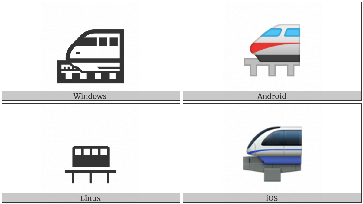 The image below shows how the “Monorail” symbol might look like on different operating systems. If the font in which this web site is displayed does not contain the symbol and there is no fallback font able to render it, you can use the image below to get an idea of what it should look like.