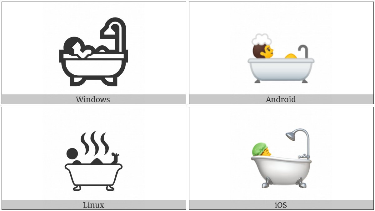 The image below shows how the “Bath” symbol might look like on different operating systems. If the font in which this web site is displayed does not contain the symbol and there is no fallback font able to render it, you can use the image below to get an idea of what it should look like.